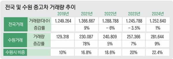 지난 2019년까지 전국 대비 수원의 중고차 시장 점유율은 10%에 불과했다. 국토교통부 통계누리 자료를 보면 매도 이전등록, 상사 간 이전등록, 알선 이전등록을 모두 합친 거래량은 지난 2019년 전국 124만9천264대 중 수원 내 거래가 12만9천318대였다. 2개의 대형 집적 매장이 들어선 2020년 이후엔 단 1년 만에 23만87대(2021년)로 거래랑이 78% 늘어나더니 매년 안정적인 성장을 거듭해 지난해엔 수원에서 28만1천644대가 거래됐다. 지난 2019년 대비 2배 이상 늘어난 것인데, 지난해 전국 중고차 거래량이 125만2천640대로 2019년 대비 횡보한 것에 비해 수원 지역의 거래량은 크게 늘어난 사실을 확인할 수 있다.