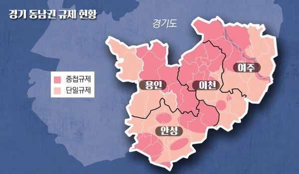 용인시와 여주시, 이천시, 안성시 등이 위치한 경기 동남권은 전국에서 대표적인 ‘중첩 규제’ 지역으로 꼽힌다. 수정법 외에 물환경보전법, 상수원보호구역, 개발제한구역 등 한두 가지가 아니다.