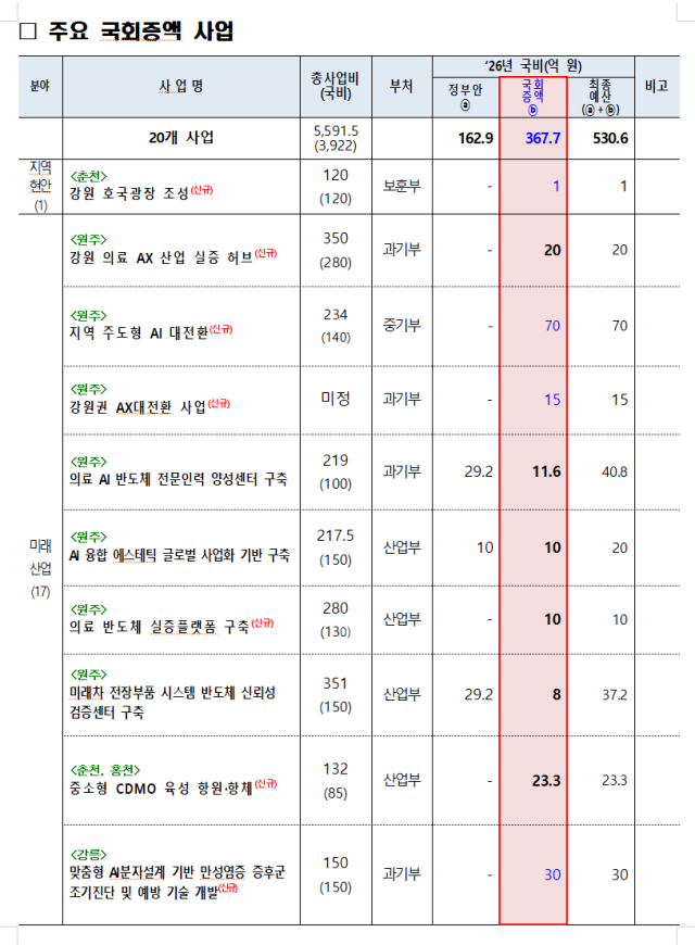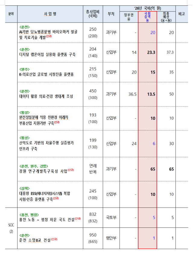 대표적인 증액 사업은 △6·25전쟁 3대 전투 중 하나인 춘천대첩을 기념하기 위한 강원 호국광장 조성 1억원 △의료 데이터 기반 암 치료 특화 인프라 구축을 위한 강원 의료 AX 산업 실증 허브 조성 20억 원(총사업비 350억원) △국내 유일 ESS 국제시험 인증 중심지 도약을 위한 3단계 사업 대용량 복합 시험·인증 플랫폼 구축 10억원(총사업비 245억원) 등이다.