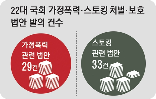 이밖에 가해자의 임시조치 종료·석방 사실 등을 피해자에게 통보하도록 하는 법안, 긴급임시조치 위반 시 현행 과태료 처분을 벌칙으로 상향해 피해자 보호를 강화하는 법안 등이 발의됐다. 이를 포함해 이번 22대 국회(17일 기준)에서 가정폭력, 스토킹 처벌·보호 관련 법안을 크고 작게 개정하는 내용의 발의안은 62건이나 올라와 있다.