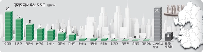 경인일보가 지난 19~20일 한국리서치에 의뢰해 경기도민 1천명을 대상으로 조사한 결과, ‘경기도지사 선거 후보로 거론되는 인물 중 누구를 지지하느냐’는 질문에 응답자의 20%는 추 전 대표를, 15%는 김 지사를 선택했다. 김은혜 국민의힘 의원은 11%, 한준호 더불어민주당 전 최고위원 8%, 안철수 국민의힘 의원 7%, 이준석 개혁신당 대표는 5%, 김병주 더불어민주당 전 최고위원은 4%였다. → 그래프 참조