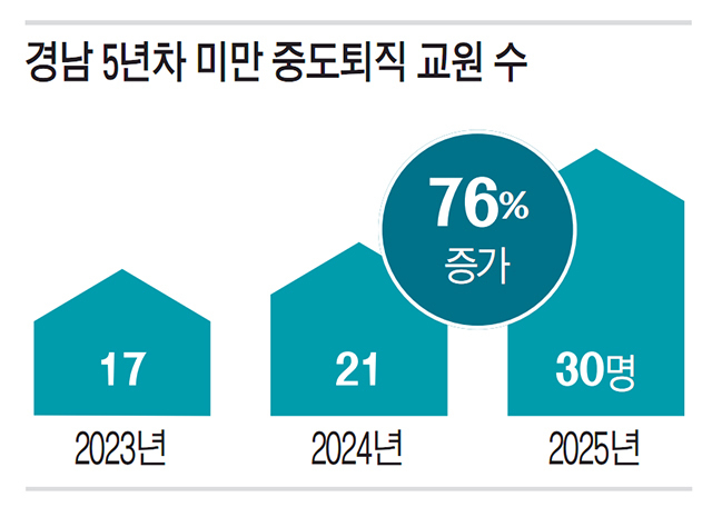 8일 교육부가 국민의힘 김대식 의원실에 제출한 자료에 따르면, 경남 지역 5년 차 미만 중도퇴직 교원은 2023년 17명에서 2024년 21명, 2025년 30명으로 3년 사이 76% 증가했다. 반면 경남 전체 중도퇴직 교원 수는 548명에서 521명, 411명으로 약 25% 감소했다.