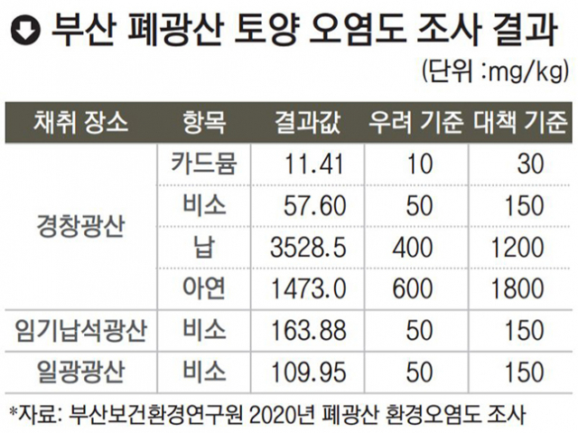부산시 등에 따르면 현재 부산 내 임기납석·일광광산, 사상구 경창광산에서 기준치 이상의 중금속이 검출되고 있다. 지난해 10~12월 부산보건환경연구원이 조사한 ‘2020년 폐광산 주변 환경오염도 조사결과’에 따르면 기장군 철마면 임기납석광산에서는 비소가 최대 163.88mg/kg 검출됐다.