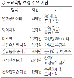 ◇급식안전 지원= 개학 후 급식과정에서 접촉에 따른 감염을 막기 위해 식탁에 칸막이를 설치한다. 이를 위한 예산 6억3000만원이 편성됐다. 또 소규모 학교의 경우 교실과 급식실에서 병행배식을 진행하며, 이를 위한 집기류 구입에도 1억5000만원이 투입된다.