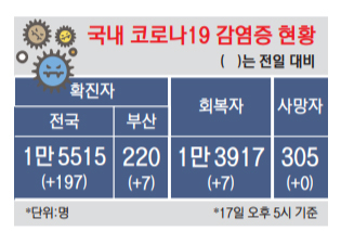 17일 중앙방역대책본부에 따르면, 이날 0시 기준으로 국내 코로나19 누적 확진자는 197명 늘어 1만 5515명으로 집계됐다. 197명 중 해외 유입은 9명에 불과했으며, 나머지 188명은 모두 지역 발생 감염자다.