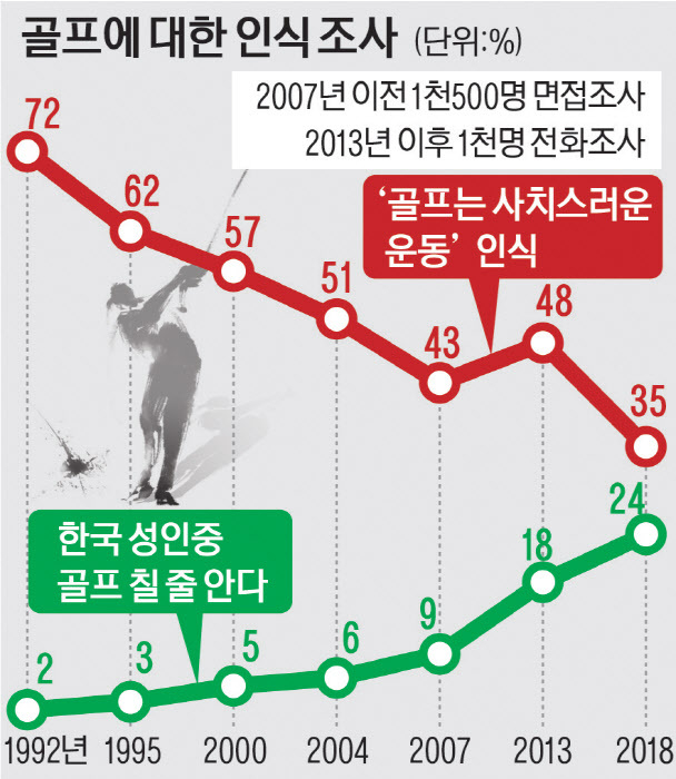 한국갤럽이 지난 1992~2018년 7회에 걸쳐 진행한 '골프에 대한 인식 조사' 자료에 따르면 "골프가 사치스러운 운동이라 생각하느냐"는 질문에 "그렇다"고 답한 비율(응답자 1천명 이상)은 처음 72%(1992년)에서 35%(2018년)로 줄었다. → 그래프 참조