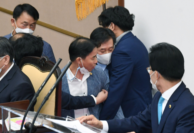 이후 의장석에 오르려는 장규석 제1부의장을 민주당 의원들이 막아섰다. 고성이 오가며 몇 분간 대치하다 반대편 계단으로 오르려던 장 부의장이 이를 막아선 송순호 의원과 서로 부딪히며 넘어졌고 김하용 의장은 더 이상 의사진행을 할 수 없다며 산회를 선포했다.