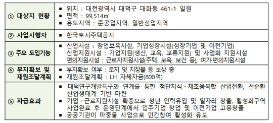 이번 대전1·2일반산단 내 산업단지 상상허브 사업은 공공주도의 마중물 사업을 통해 민간참여로 연계되는 후속 투자기반을 유도, 첨단 산단으로 전환하는 계기를 마련하고 근로자 지원시설을 확충해 신규 일자리 창출 등의 효과가 있을 것으로 전망된다.