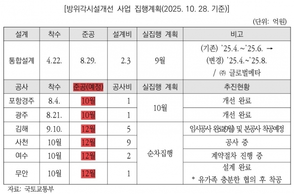 광주·포항공항은 개선이 완료됐고, 무안·김해·사천공항은 공사가 진행 중이며, 여수공항은 계약 절차가 진행 중이다.
