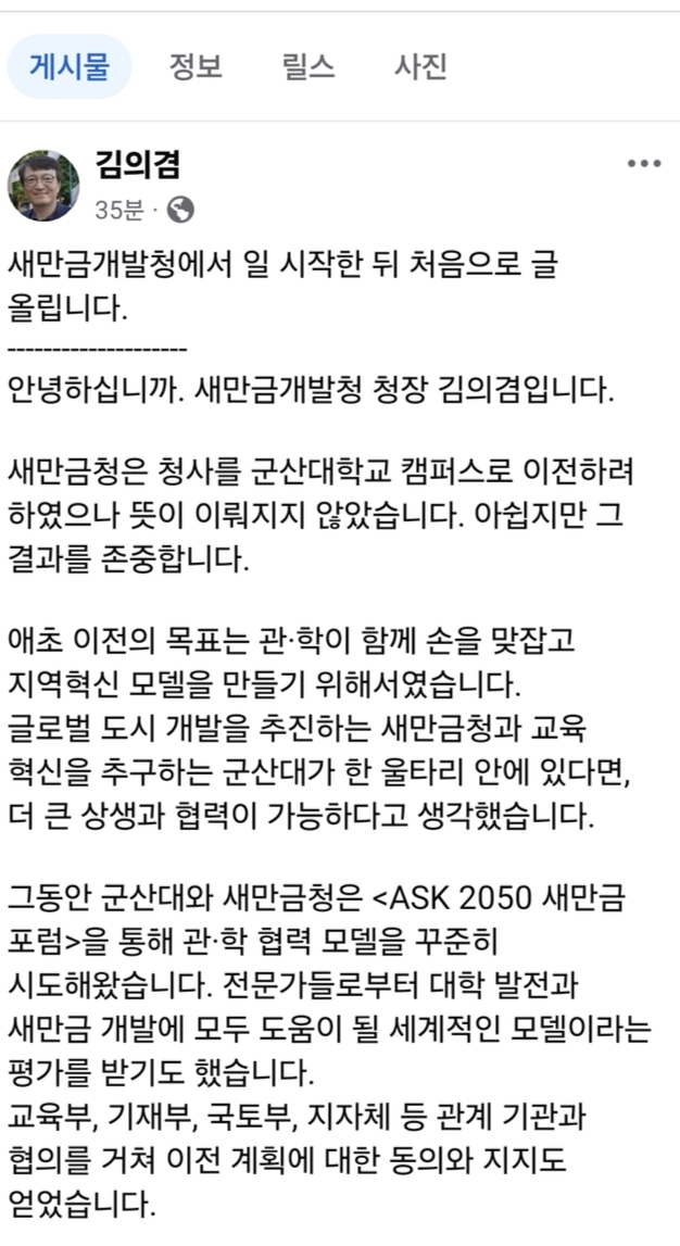 김의겸 새만금개발청 청장은 7일 SNS(사회관계망서비스)를 통해 “새만금청은 청사를 군산대학교 캠퍼스로 이전하려 하였으나 뜻이 이뤄지지 않았다”며 “아쉽지만 그 결과를 존중한다”고 밝혔다.