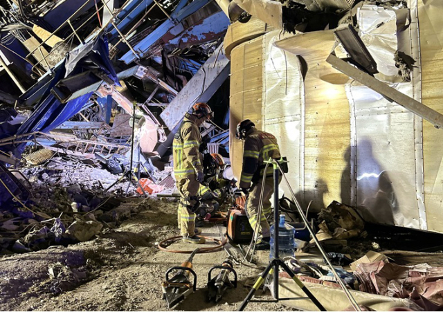전날 구조 작업의 장애물이던 4·6호기 타워를 발파 해체 후 붕괴한 5호기 타워에 대한 수색이 본격적으로 이뤄지고 있다. 현재 5호기 잔해 속에 2명이 매몰된 상태다.