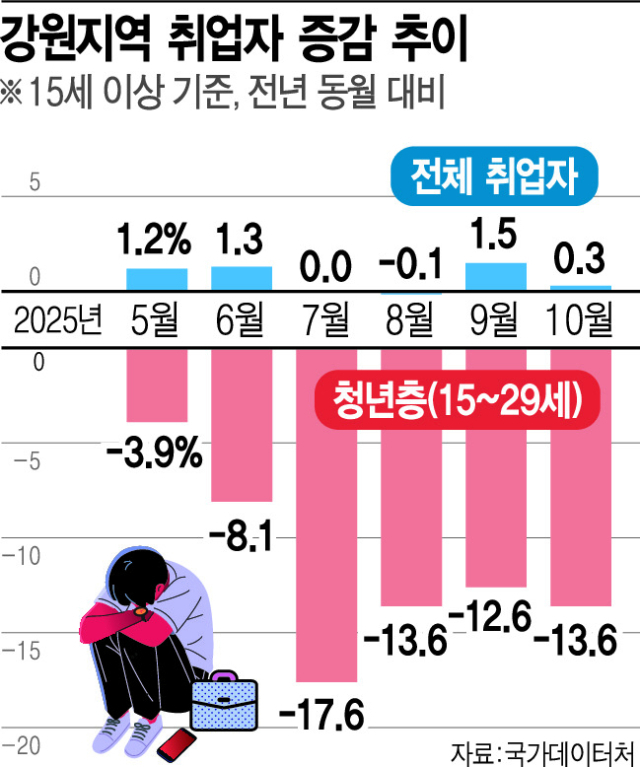 강원지역 실업자 수가 1년 새 50% 넘게 급증했다. 여기에 청년 취업자 수가 올해 1월부터 10개월 연속으로 감소하는 등 고용시장 한파가 지속되고 있다.