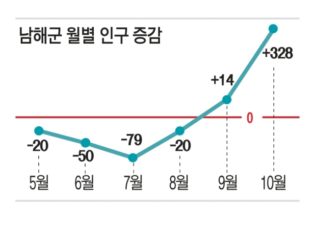 남해군 인구가 지난 9월 14명 증가에 이어 10월 328명이 느는 등 이례적으로 증가하고 있다. 전북 순창군 사례 등에서 나타나듯 내년 1인당 15만원의 지역사랑상품권을 받는 ‘농어촌기본소득 시범지역’이라는 정책적 특수가 가져온 일시적 현상인지 아니면 구조적인 반등이 있는 것인지는 알 수 없다. 다만, 2024년 연말 3만9832명으로 4만명이 붕괴된 뒤 연초부터 계속 줄던 인구가 9월, 10월 잇따라 증가하고 있는 것은 긍정적인 시그널이다.