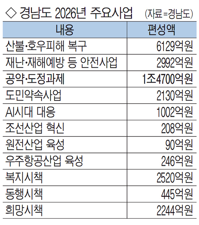 이 밖에도 경남수목원 무장애길 나눔길 조성 14억원, 도립미술관 남부전시관 조성 10억원과 함께 산불방지 헬기 임차(7대→10대) 137억원, 어린이집 필요경비 지원(3~5세→2~5세) 117억원, 의료·요양·돌봄 통합지원(김해 시범→전 시군 확대) 70억원 등도 포함됐다.