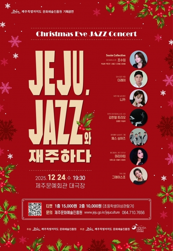 이희진 제주문화예술진흥원장은 “재즈의 매력을 제주에서 느낄 수 있도록 다양한 프로그램을 구성했다”며 “연말을 맞아 도민들이 가족, 친구, 연인과 함께 따뜻한 시간을 보내길 바란다”고 밝혔다.