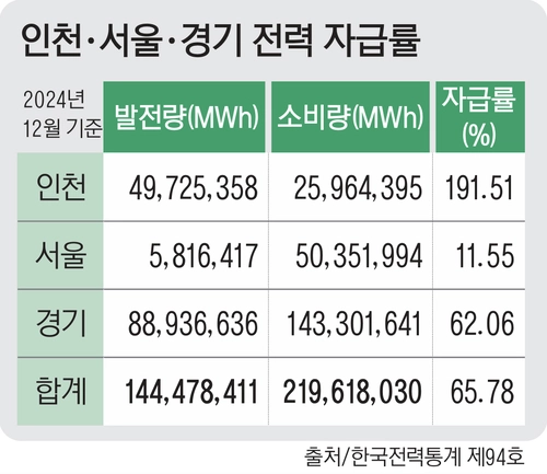 전력자급률이 높은 도시 인천 입장에서는 대통령이 지산지소를 강조한 것은 반길 일이다. 하지만 이 같은 방침이 ‘균형발전’이라는 정부 기조와 함께 언급되면 결코 단순치 않다. 생산지와 소비지, 전력자급률을 판단하는 권역을 어떤 단위로 어떻게 묶느냐에 따라 인천 전기요금이 크게 뒤바뀔 수 있기 때문이다. 지난해 기준으로 인천 전력자급률은 191.5%로 발전량이 소비량보다 거의 두 배다. 17개 시도 가운데 4번째로 높다. 반면 경기는 62.06%(12위), 서울은 11.55%(15위)로 바닥권이다. → 표 참조