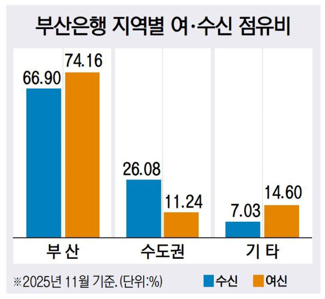 실제 부산은행의 예수금 중 수도권 지역에서 조달해온 돈의 점유 비율은 11월 말 기준 26.08%에 달한 반면, 대출에서는 수도권이 차지하는 비중이 11.24%에 불과했다. 부산은행은 서울, 경기, 인천, 대전을 수도권으로 분류했다.