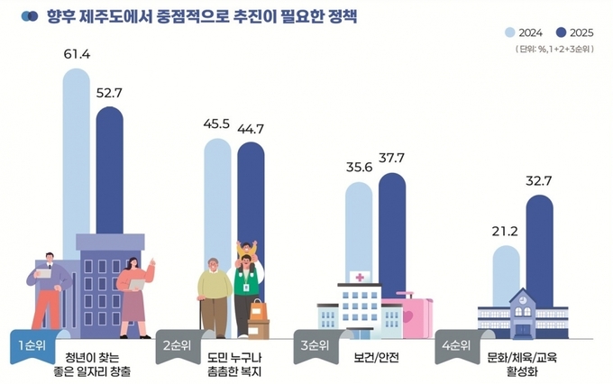 25일 제주특별자치도가 발표한 ‘2025 제주의 사회지표’에 따르면 도민들은 도가 집중해야 할 정책으로 청년이 찾는 좋은 일자리 창출(52.7%)을 1순위로 꼽았다.