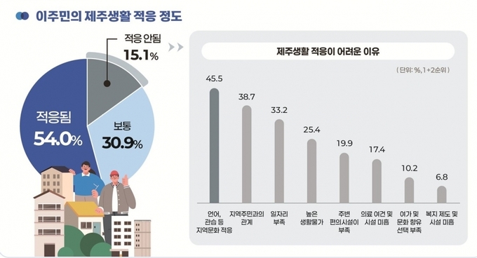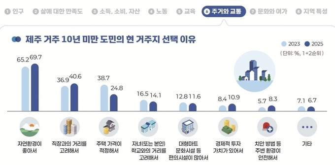 제주를 거주지로 선택한 이유로는 자연환경이 좋아서(69.7%), 직장과의 거리를 고려해서(40.6%) 등을 꼽았다. 제주 생활 적응이 어려운 이유는 언어·관습 등 지역문화 적응(45.5%), 지역 주민과의 관계(38.7%), 일자리 부족(33.2%) 순으로 나타났다.