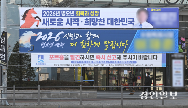 도내 한 지자체 관계자는 “개인이 현수막을 대량으로 게시하거나 지속적으로 내걸 경우 과태료를 부과할 수 있지만, 새해 인사 현수막은 잠깐 걸었다가 떼기 때문에 일일이 단속하긴 어렵다”며 “일주일새 관련 민원이 20건 넘게 들어와서 관련 현수막들을 철거하고 있다”고 말했다.