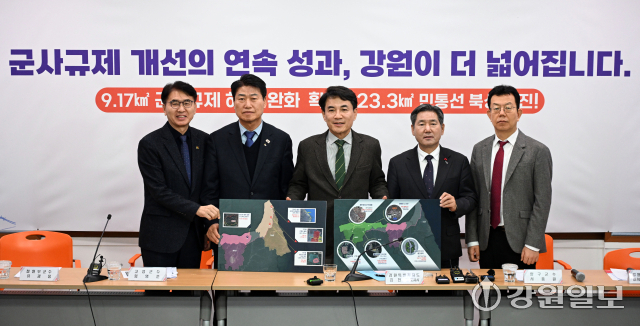 김진태 강원특별자치도지사와 서흥원 양구군수, 함명준 고성군수, 유광종 철원부군수는 14일 도청 브리핑룸에서 공동으로 ‘군사시설보호구역 규제개선 현황’을 발표했다.