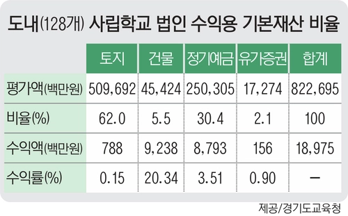 지난 2023년 7월 1일 기준으로 경기도교육감의 지도·감독을 받는 128개 학교법인의 수익용 기본재산 중 토지가 62%로 가장 큰 비중을 차지했다. 정기예금이 30.4%로 뒤를 이었고 건물 5.5%, 유가증권 2.1% 순이었다. 특히 도내 농촌 지역에 위치한 학교들의 경우 토지의 가치가 높지 않아 수익 창출이 힘들 수밖에 없다.