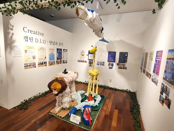 시선을 뒤편으로 돌리면 트윈웨이브 이용자들이 서로의 취향을 함께 나누며 완성한 창작물들이 보인다. 트윈웨이브에서는 이용자가 직접 프로그램을 기획하고 진행하는 ‘캡틴의 D.I.O’라는 활동이 있는데, 이를 통해 비슷한 취미를 가진 청소년들이 모여 만든 기린, 사자, 고래 등이 전시됐다. 창작물 뒤편으로는 작품을 함께 만들 팀원을 구하기 위해 이용자들이 만든 다양한 포스터가 보인다.