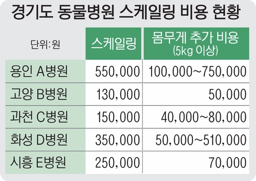 실제 경기지역 동물병원 5곳에 스케일링 비용을 문의한 결과, 기본 의료비와 몸무게에 따른 추가 비용이 다르게 조사됐다.