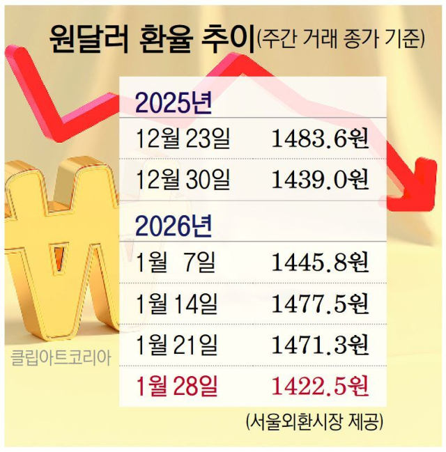 28일 서울외환시장에 따르면 원달러 환율은 오후 3시 30분 주간거래 종가 기준으로 전 거래일보다 23.7원 급락한 1422.5원으로 마감했다. 이는 외환 당국이 개입했던 지난달 29일(1429.8원)보다도 낮은 수준이다. 당시 환율은 3거래일 동안 53.8원 하락한 바 있다.