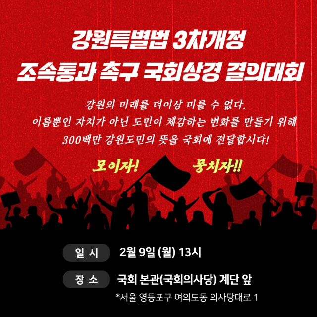 강원특별자치도 범국민추진협의회(범추협)는 3일 비공개로 긴급회의를 열고 오는 9일 오후 국회에서 상경집회를 열기로 했다.
