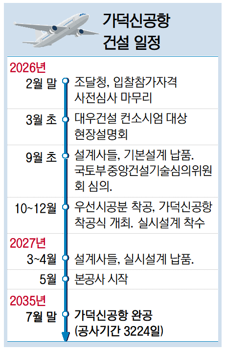 입찰공고서에는 공사기간은 착공 후 3224일로 돼 있다. 8년 10개월이다. 만약 오는 10월 우선시공분 공사가 시작되면 완공 시점은 2035년 7월 말이다. 물론 기상 여건 등에 따라 다소 조정될 수 있지만 이 범주를 크게 벗어나지 않을 것으로 보인다. 국토부는 건설사가 요구하는 충분한 공기를 제공했기 때문이다.