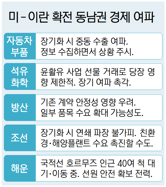 부산 지역 기업들은 중동과 직접적인 연관은 적은 편이지만, 장기적인 여파에 주목하고 있다. 부산상공회의소 측은 “부산 기업 수출에서 중동의 비중은 한 자릿수이고, 윤활유 사업이 중심인 지역 석유화학 업계도 당장 영향은 제한적이다”며 “사태가 장기화될 경우 자동차 부품업계에 수출 여파가 있을 수 있고, 유가와 환율의 영향은 산업 전반에 미칠 수 있어 상황을 예의주시하고 있다”고 말했다.