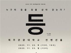 예술공간 오이는 오는 22일(오후 3시, 7시)과 23일(오후 3시) 제주관광대학교 컨벤션홀에서 연극 ‘등’(연출 전혁준)을 공연한다. 지역대표 예술단체 지원사업으로 선보이는 4개의 공연 중 마지막 무대다. ‘등’은 정의와 인간다움을 등이라는 알레고리로 풀어낸 이 작품은 모든 것이 제자리로 돌아가는 풍경을 보기 위해서 우리는 어떻게 살아야 할 것인지를 관객들에게 묻는다. 작품을 쓰고 연출을 맡은 전혁준씨는 “팩션 판타지를 표방한 이 작품은 사실에 기반을 둔 등장인물들이 허구의 세계관 속에서 새로운 서사를 만들었다”고 말했다.