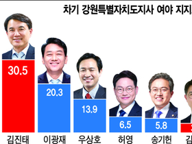 내년 6·3 지방선거를 앞두고 강원일보가 강원지역 언론사 가운데 처음으로 실시한 강원특별자치도지사 후보 지지도 조사에서 국민의힘 김진태 지사가 오차범위 밖에서 선두를 달리고 있는 것으로 나타났다. 더불어민주당 이광재 전 지사와 우상호 대통령실 정무수석은 그 뒤를 이어 추격 그룹을 형성했다. 강원일보가 창간 80주년을 맞아 여론조사 전문기관인 (주)리얼미터에 의뢰해 지난달 31일부터 지난 1일까지 강원특별자치도에 거주하는 만 18세 이상 남녀 2,019명을 대상으로 '도지사 선거 출마가 거론되는 여야 인물 중 어느 후보를 가장 지지하느냐'고 물은 결과(95% 신뢰수준에 표본오차 ±2.2%포인트) 30.5%가 김진태 지사를 선택했다. 2022년 6월 지방선거 당시 김 지사와 대결했던 민주당 이광재 전 지사는 20.3%, 철원 출신의 우상호 정무수석은 13.9%를 얻었다. 민주당 허영(춘천갑) 국회의원 6.5%, 민주당 송기헌(원주을) 국회의원 5.8%, 김완섭 전 환경부 장관이 3.7%로 그 뒤를 이었다. 아직 선거일까지 7개월가량 남아있는만큼 '없음'(8.2%)과 '잘 모름'(9.2%) 등을 고른 부동층도 17.4%에 달했다. 범여권 주자들만을 대상으로 한 후